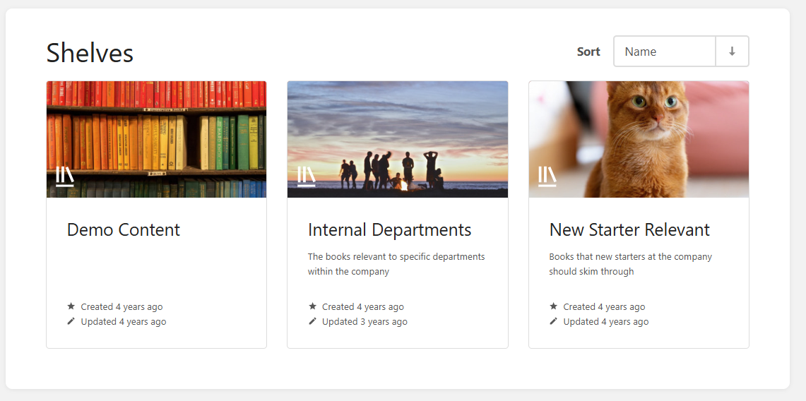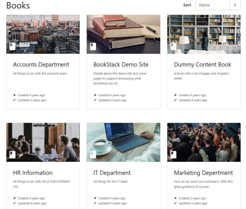 Shelves overview: The Shelves page displays all available Shelves as cards, each representing a category that groups related Books. Users can browse Shelves, view their descriptions, and sort them by name for easier. (Source: Screenshot from the BookStack demo instance at https://demo.bookstackapp.com/)